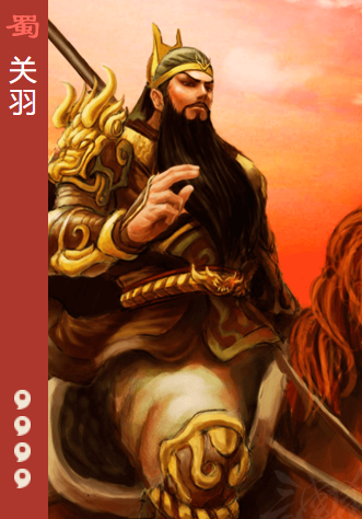 武将生平:字云长,本字长生,并州河东解州人。五虎上将之首,爵至汉寿亭侯,谥曰“壮缪侯”。被奉为“关圣帝君”,崇为“武圣”。